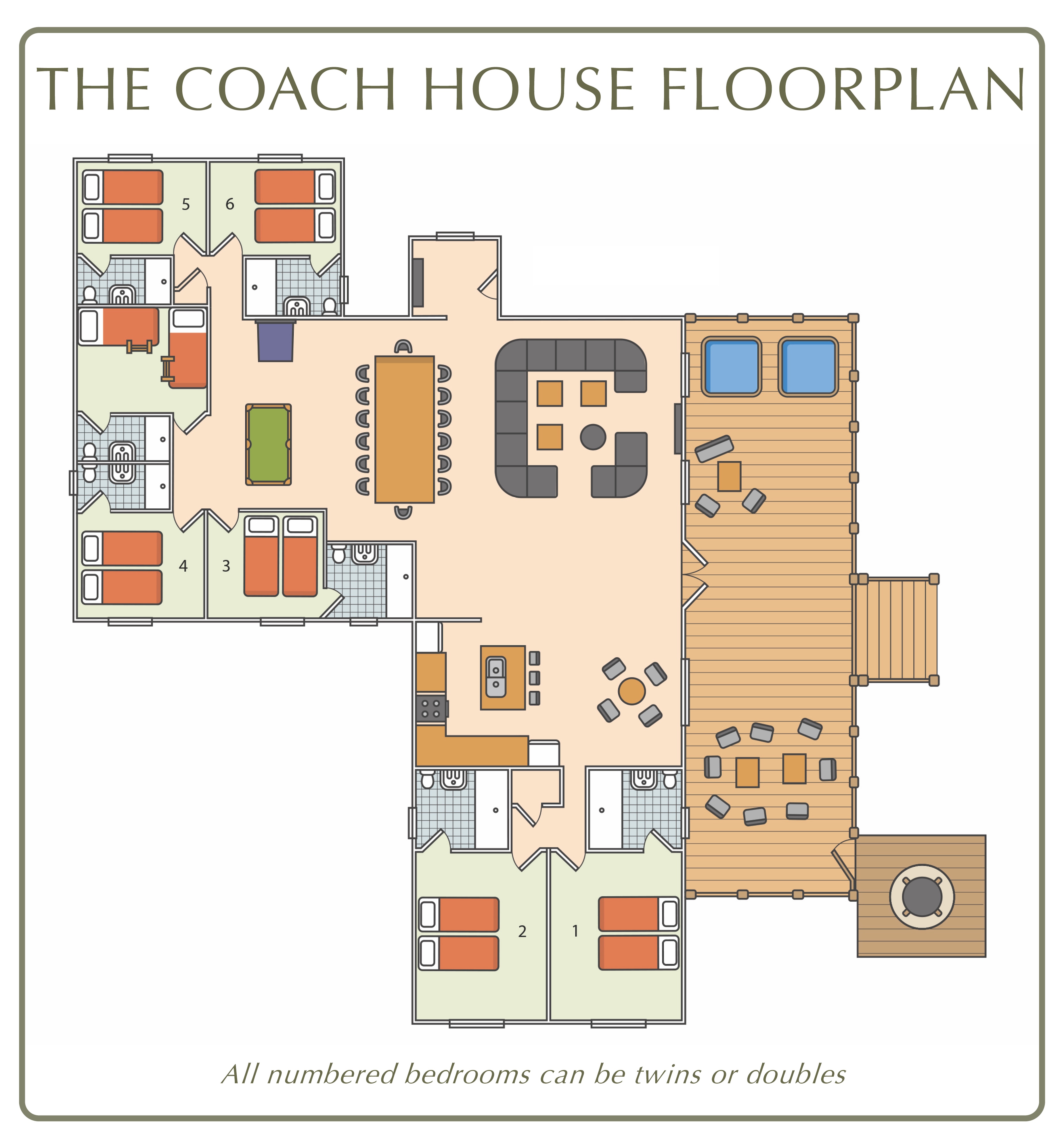 The Coach House has seven bedrooms – split at each end of the lodge enabling plenty of space and privacy for family groups and friends - all with luxury ensuite shower rooms. Six of the bedrooms come with super king size beds and the seventh is a double bunk bedroom with two sets of full size bunks beds. Each bedroom features a wardrobe hanging area, dressing table and TV.