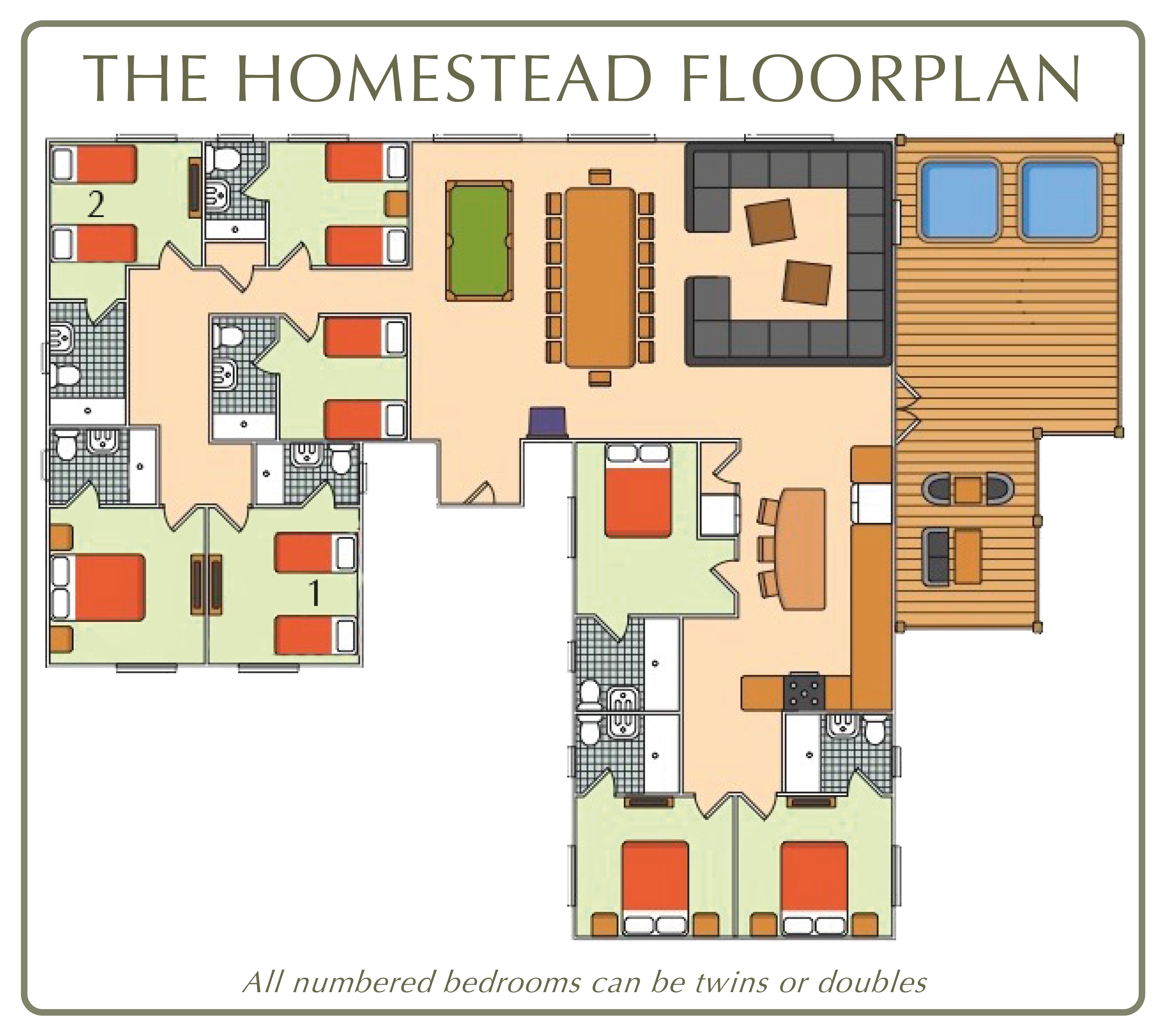 The Homestead has eight spacious bedrooms – five bedrooms at one end of the lodge and a further three on the other side. Enabling plenty of space and privacy for family groups and friends - all with luxury ensuite shower rooms. Four of the bedrooms come with king size beds, two have beds that can be split into twins and the remaining two have twin beds. Each bedroom features a wardrobe hanging area, dressing table and TV.