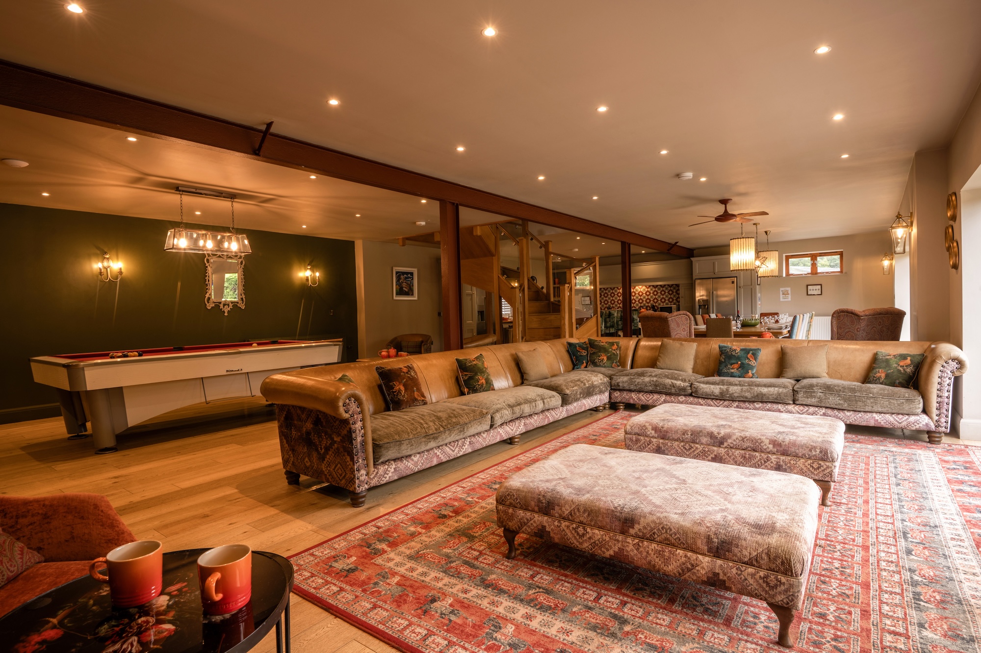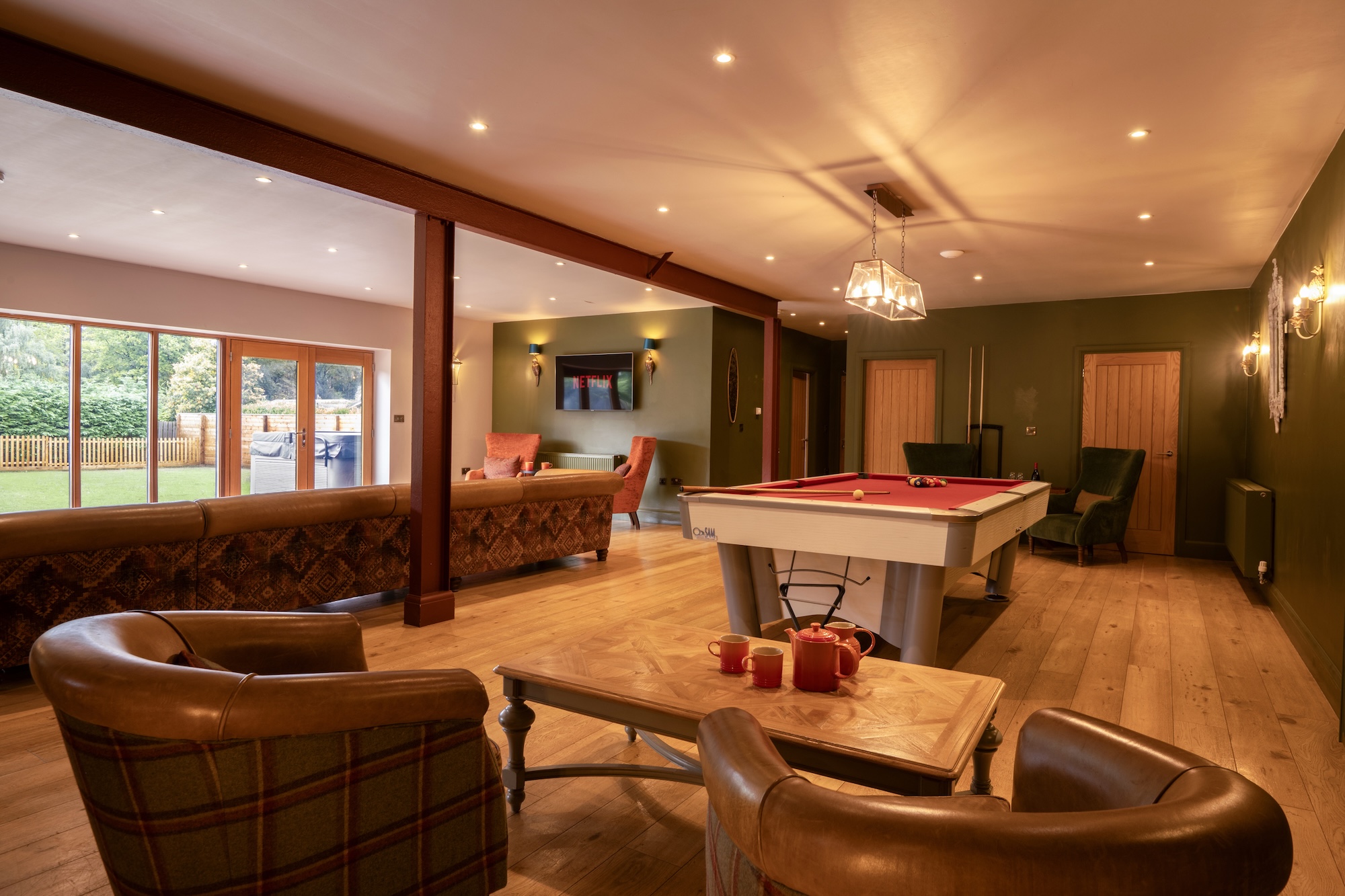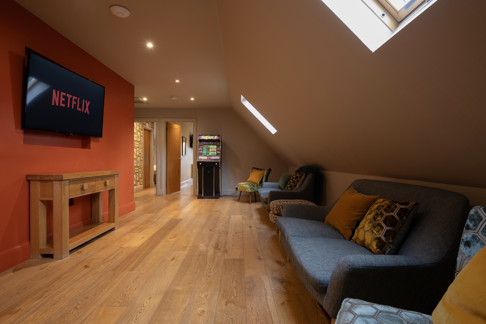 On the ground floor you will a find a beautiful open plan kitchen, with a generous centre island, perfect for socialising and entertaining, a 14 seater dining table, separate sitting area, and a bespoke 14 seat sofa centred around a 55" smart TV, ideal for movie nights in. There is also an American pool table and a retro arcade video game, offering further opportunities for fun.