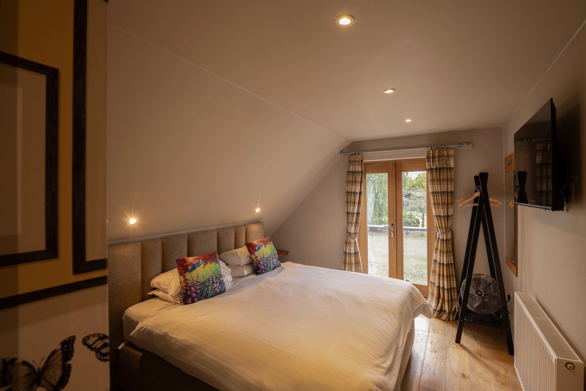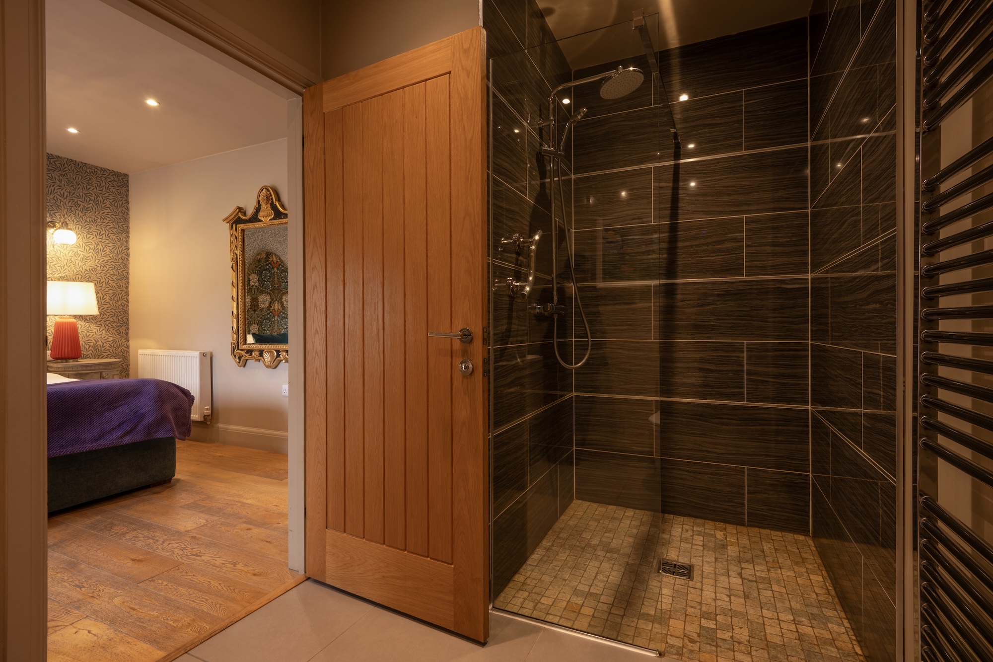There are two super king sized bedrooms on the ground floor, both with ensuite shower rooms. These have been designed with disabled access in mind, featuring wet rooms and grab rails. One of the ground floor bedrooms also has direct access onto the decking area via patio doors. There is also an additional WC on this level for guests to use.