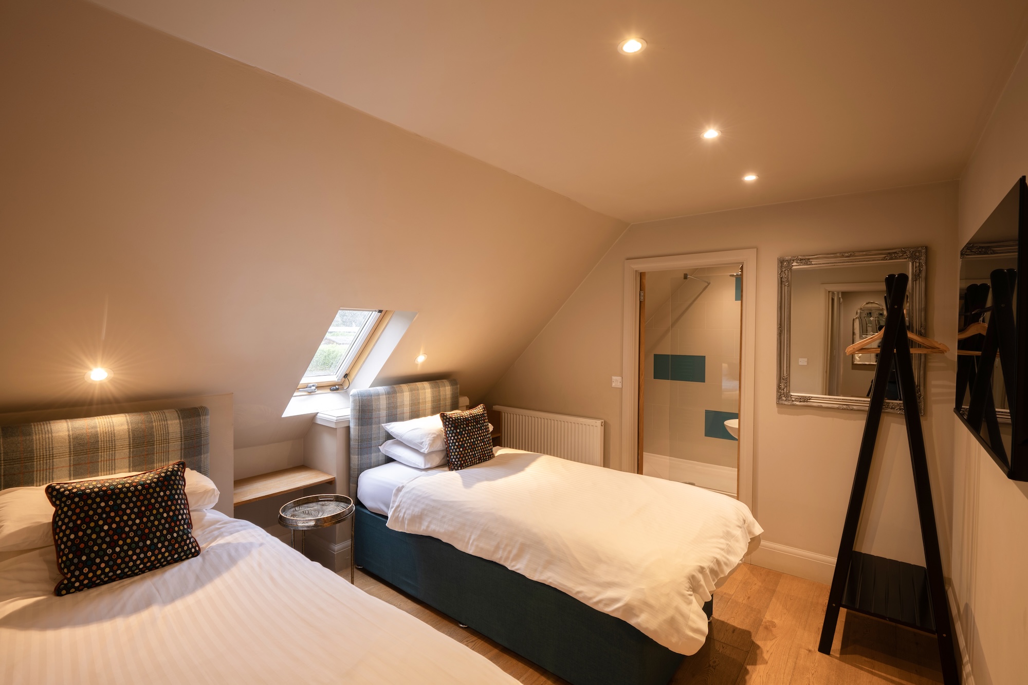 There are five further bedrooms on the second floor, in the eaves of the building. Two bedrooms feature super-king size beds that can be split into twin beds and ensuite walk in shower rooms. A further twin bedroom also features an ensuite walk in shower room. The final two super-king bedrooms share a separate family shower room, these can also be splint into twin beds. All of the bedrooms have TVs.