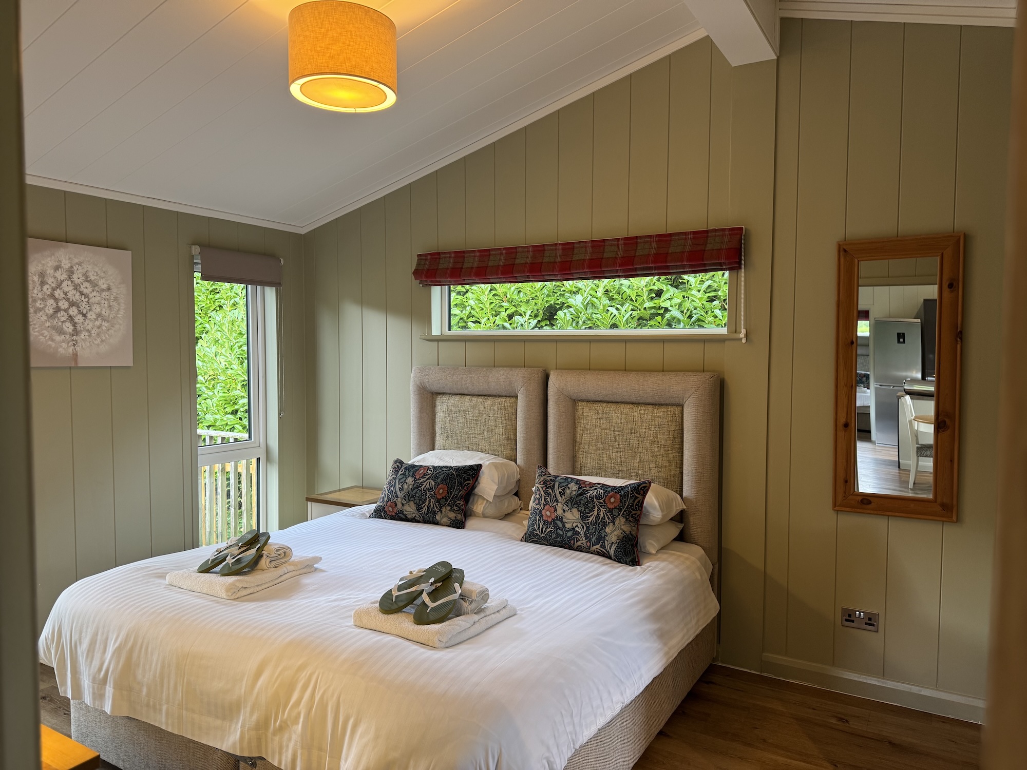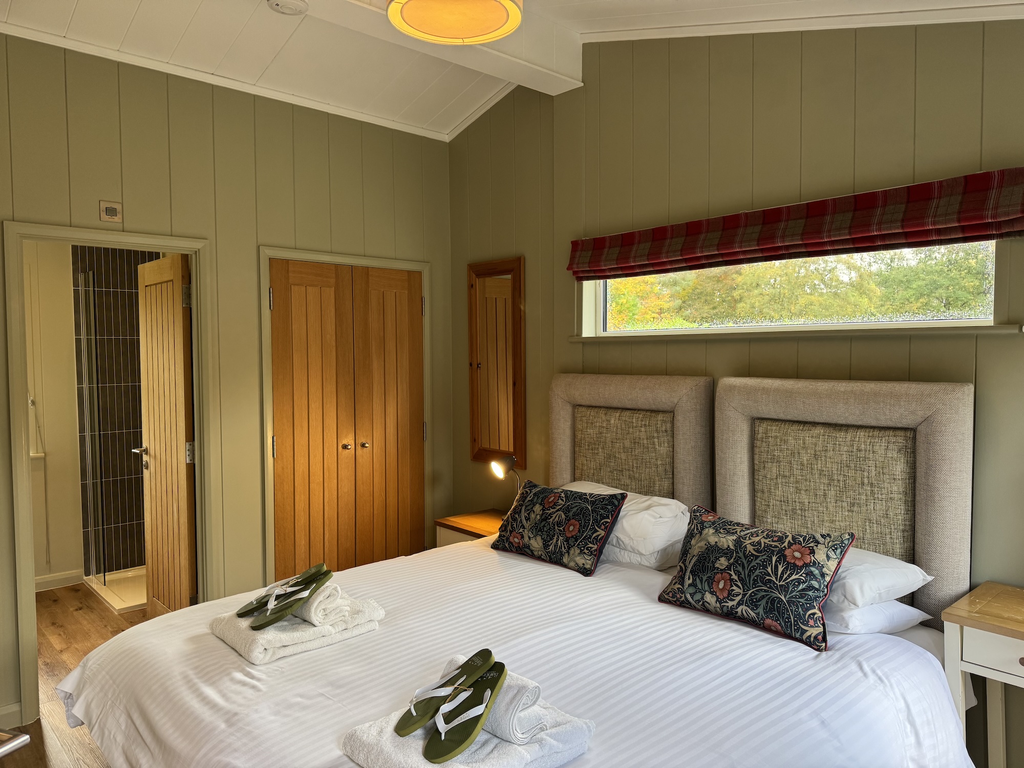 At opposite ends of the lodge are the two bedrooms that can either be kings or twins, with ensuite shower rooms. Both rooms have a wardrobe, dressing table and TV.