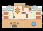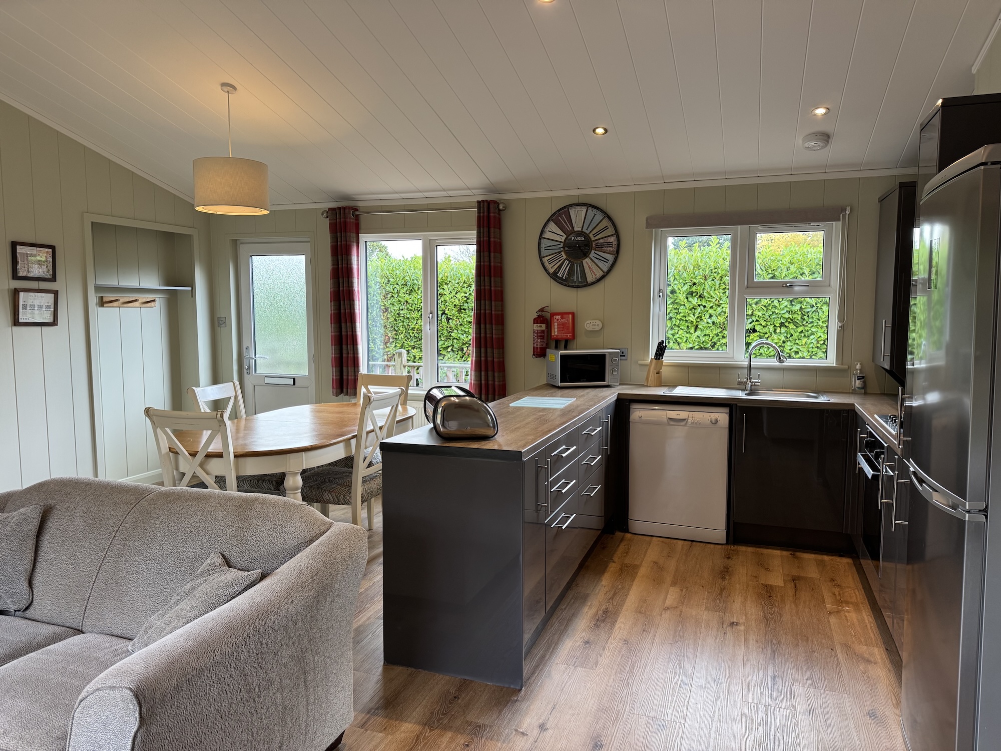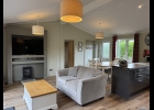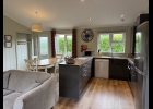 Part of our standard collection these comfortable lodges offer bright open plan living spaces for families to relax in. The fully fitted kitchen offers everything you need, including an oven, hob, fridge freezer, dishwasher and all the necessary crockery, cutlery and utensils. There is a dining table for six and two comfy sofas from which to watch the 55" smart TV. Patio doors lead out to a private decked terrace with an outdoor sunken hot tub and steps down to the enclosed garden.