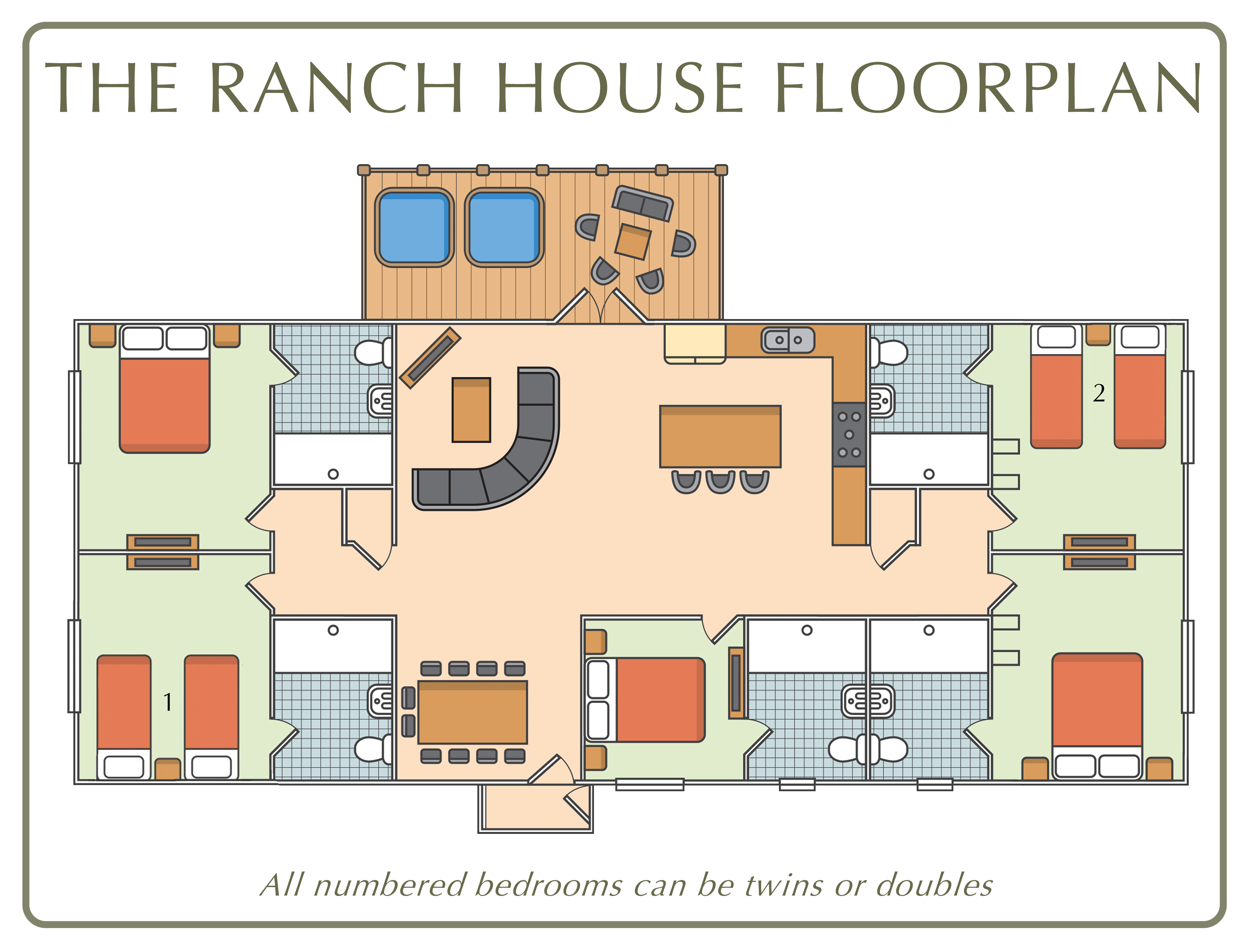 The Ranch House has five spacious double bedrooms - 3 with king size beds and 2 with super king size beds that can be split into twin beds, all are complete with luxury ensuite shower rooms. Each bedroom features a wardrobe hanging area, dressing table and TV.